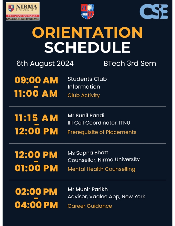The Semester-III CSE students’ orientation is scheduled for August 5th and 6th, 2024, at the NIM auditorium. The schedule is attached for your reference.