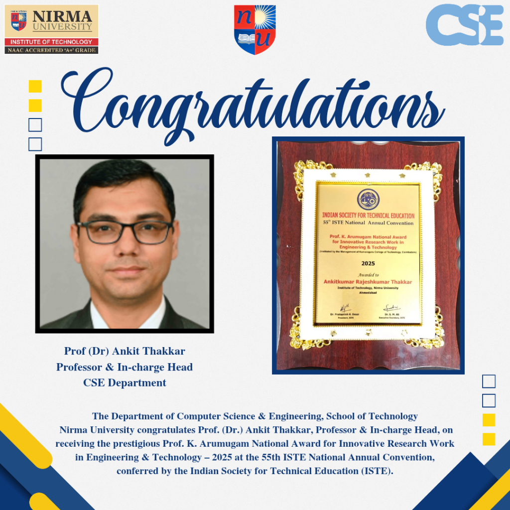 The Department of Computer Science & Engineering, School of Technology, Nirma University congratulates Prof. (Dr.) Ankit Thakkar, Professor & In-charge Head, on receiving the prestigious Prof. K. Arumugam National Award for Innovative Research Work in Engineering & Technology – 2025 at the 55th ISTE National Annual Convention, conferred by the Indian Society for Technical Education (ISTE).