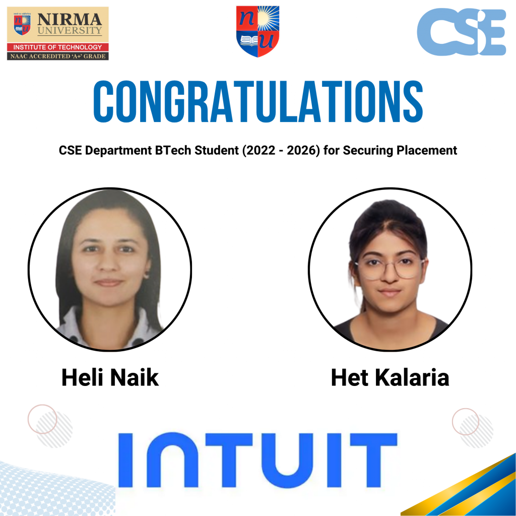 Congratulations to Computer Science and Engineering Department, School of Technology, Nirma University BTech students on securing a placement in Intuit! Wishing a successful and innovative career ahead!