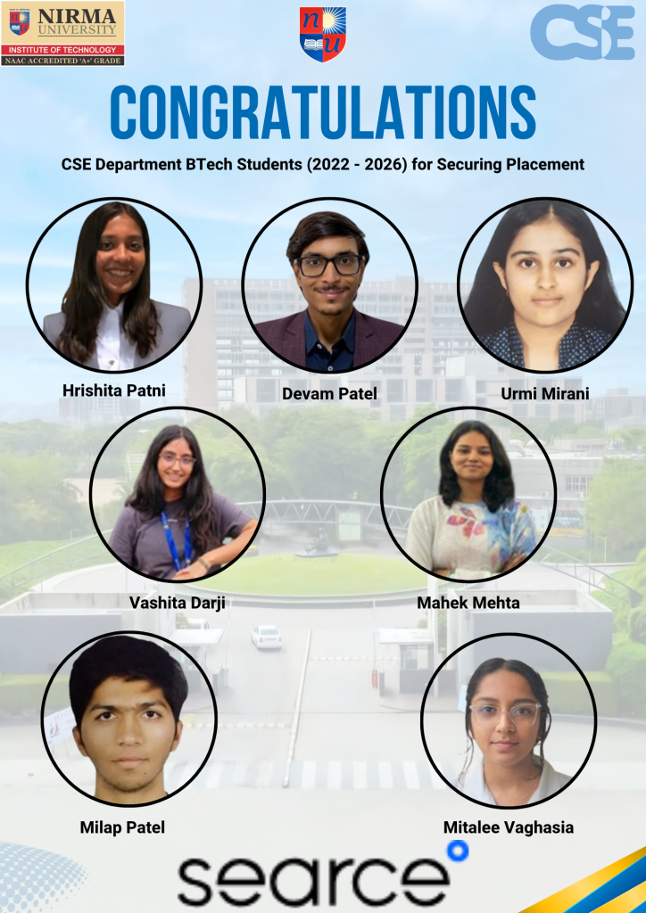Congratulations to Computer Science and Engineering Department, School of Technology, Nirma University BTech students on securing a placement in Searce! Wishing a successful and innovative career ahead!