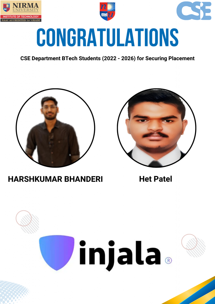 Congratulations to Computer Science and Engineering Department, School of Technology, Nirma University BTech students on securing placement in Injala! Wishing a successful and innovative career ahead!