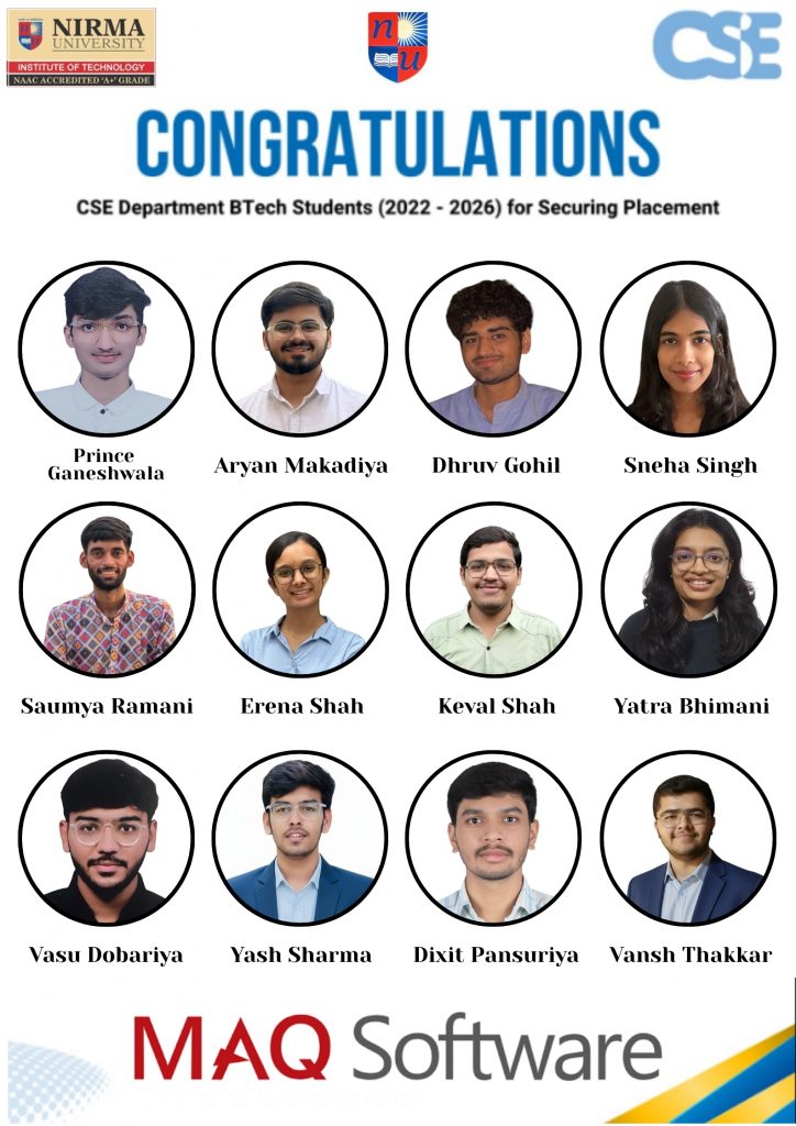 Congratulations to Computer Science and Engineering Department, School of Technology, Nirma University BTech students on securing a placement in MAQ Software! Wishing a successful and innovative career ahead!