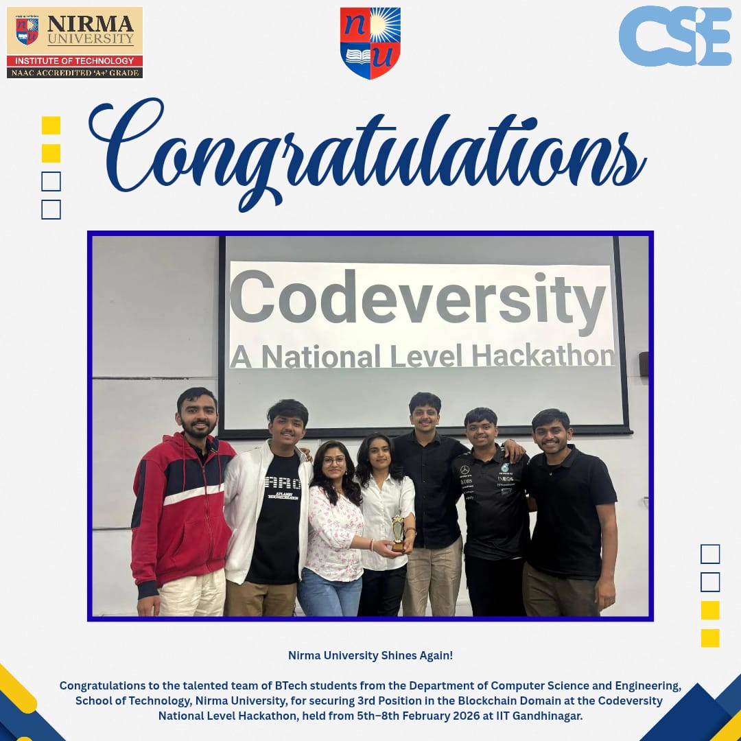 Congratulations to the talented team of BTech students from the Department of Computer Science and Engineering, School of Technology, Nirma University, for securing 3rd Position in the Blockchain Domain at the Codeversity National Level Hackathon, held from 5th–8th February 2026 at IIT Gandhinagar.