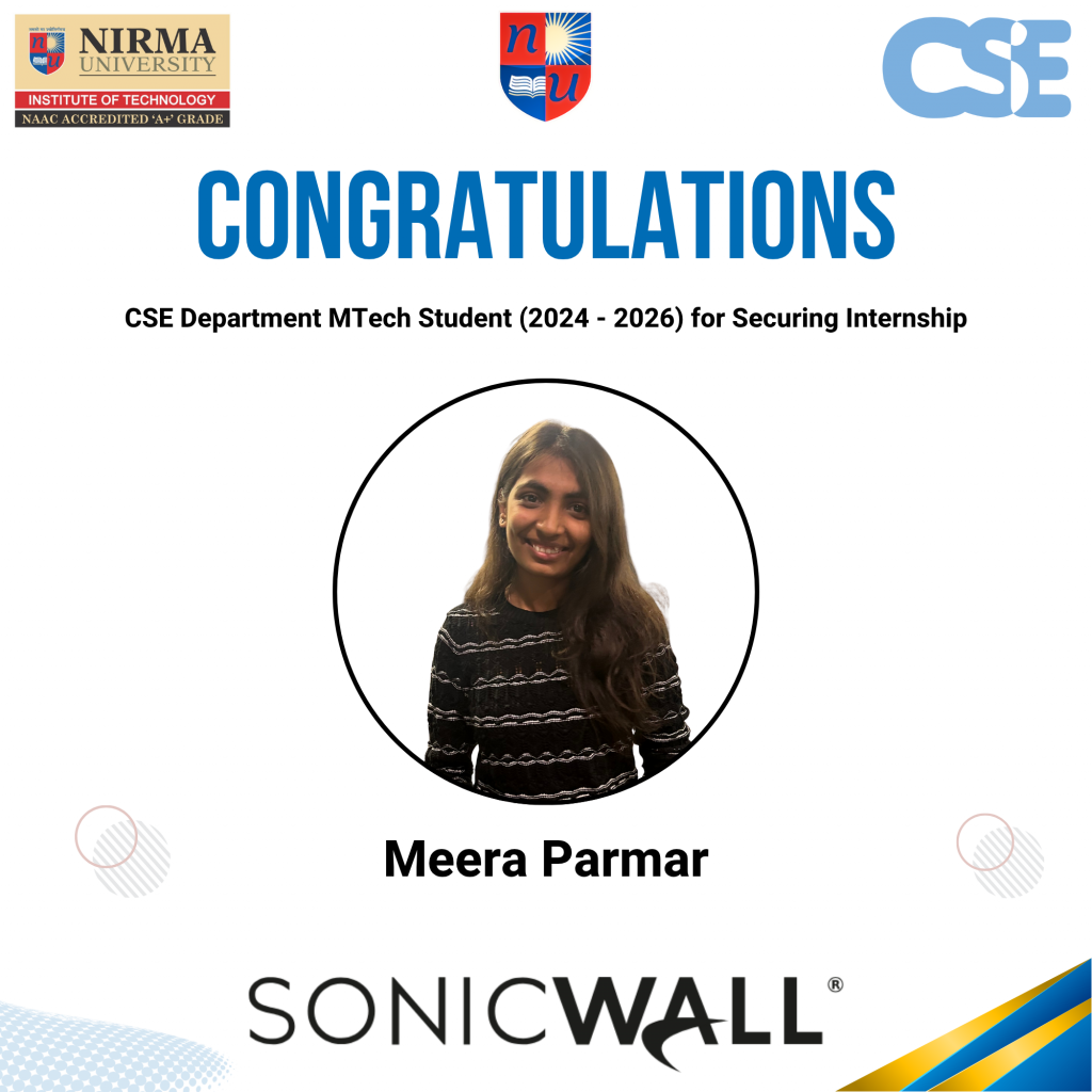 Congratulations to Computer Science and Engineering Department, School of Technology, Nirma University MTech student Meera Parmar on securing an internship in SonicWall! Wishing a successful and innovative career ahead!