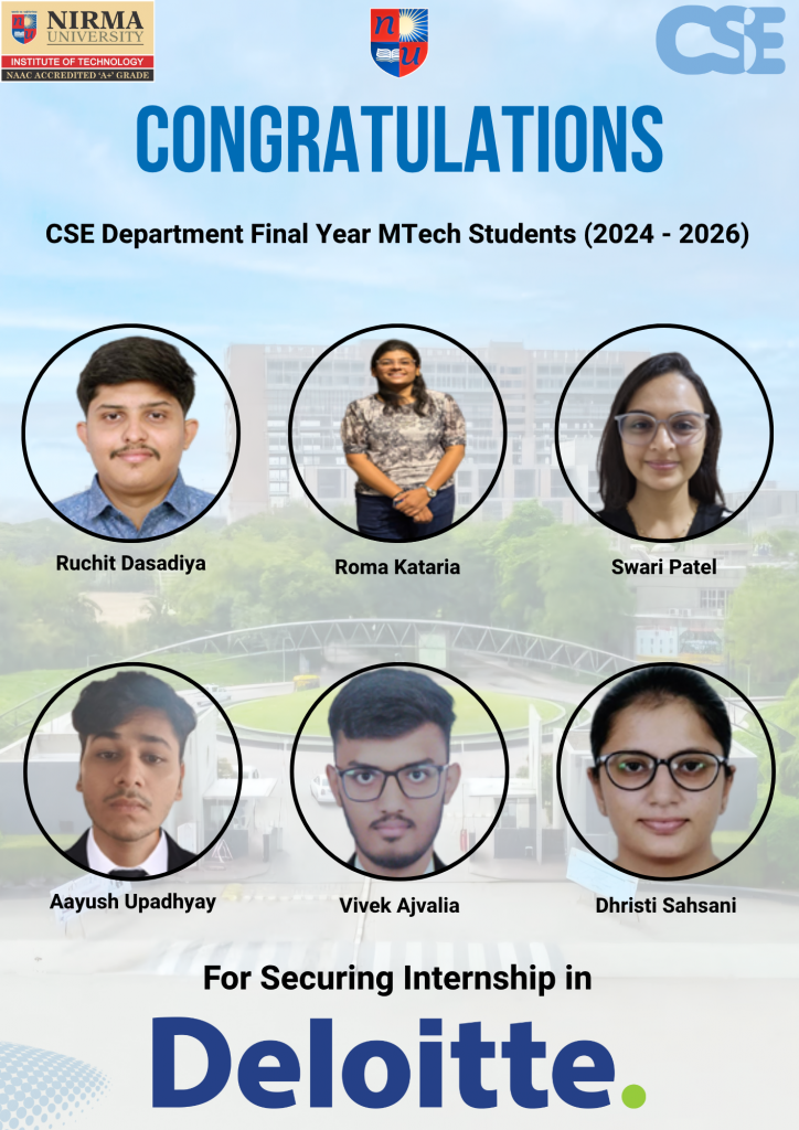 Congratulations to Computer Science and Engineering Department, School of Technology, Nirma University MTech students on securing an internship in Deloitte! Wishing a successful and innovative career ahead!