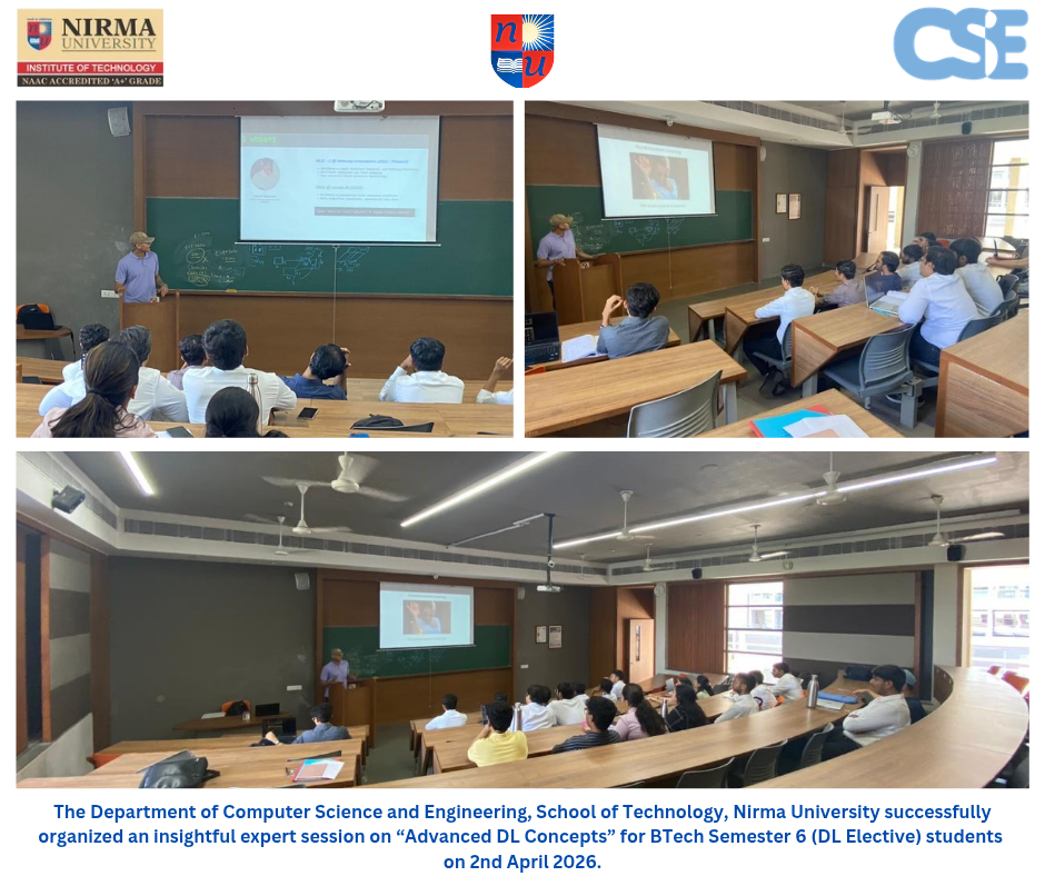 The Computer Science and Engineering Department, School of Technology, Nirma University successfully organized an insightful expert session on “Advanced DL Concepts” for BTech Semester 6 (DL Elective) students on 2nd April 2026.
