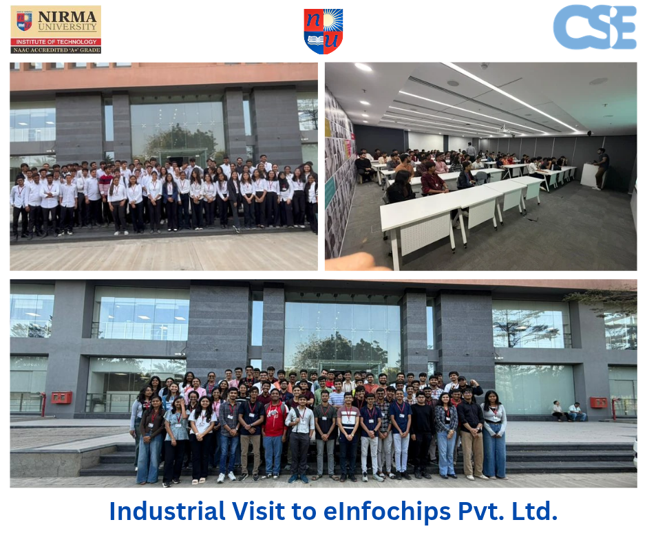 We successfully organized an Industrial Visit to eInfochips (An Arrow Company), Ahmedabad, for BTech, Semester 4 students of the Computer Science and Engineering Department, School of Technology, Nirma University. More than 320 students participated in this enriching industry exposure visit.
