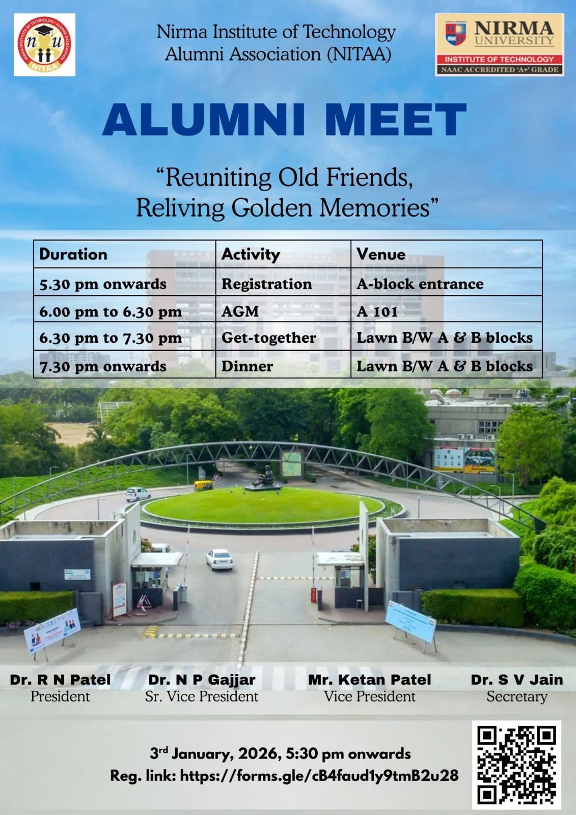 The Nirma Institute of Technology Alumni Association (NITAA) is delighted to invite all alumni to the Alumni Meet 2026β€”an evening filled with nostalgia, networking, and celebration.