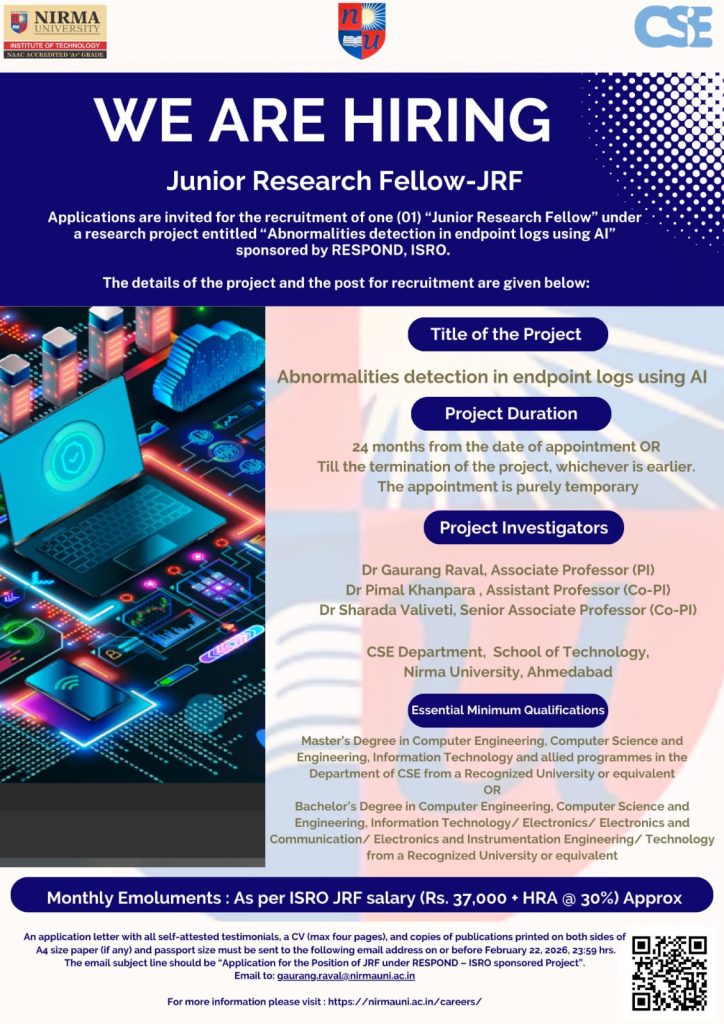 The Department of Computer Science & Engineering, School of Technology, Nirma University invites applications for one (01) Junior Research Fellow (JRF) for a cutting-edge research project titled: