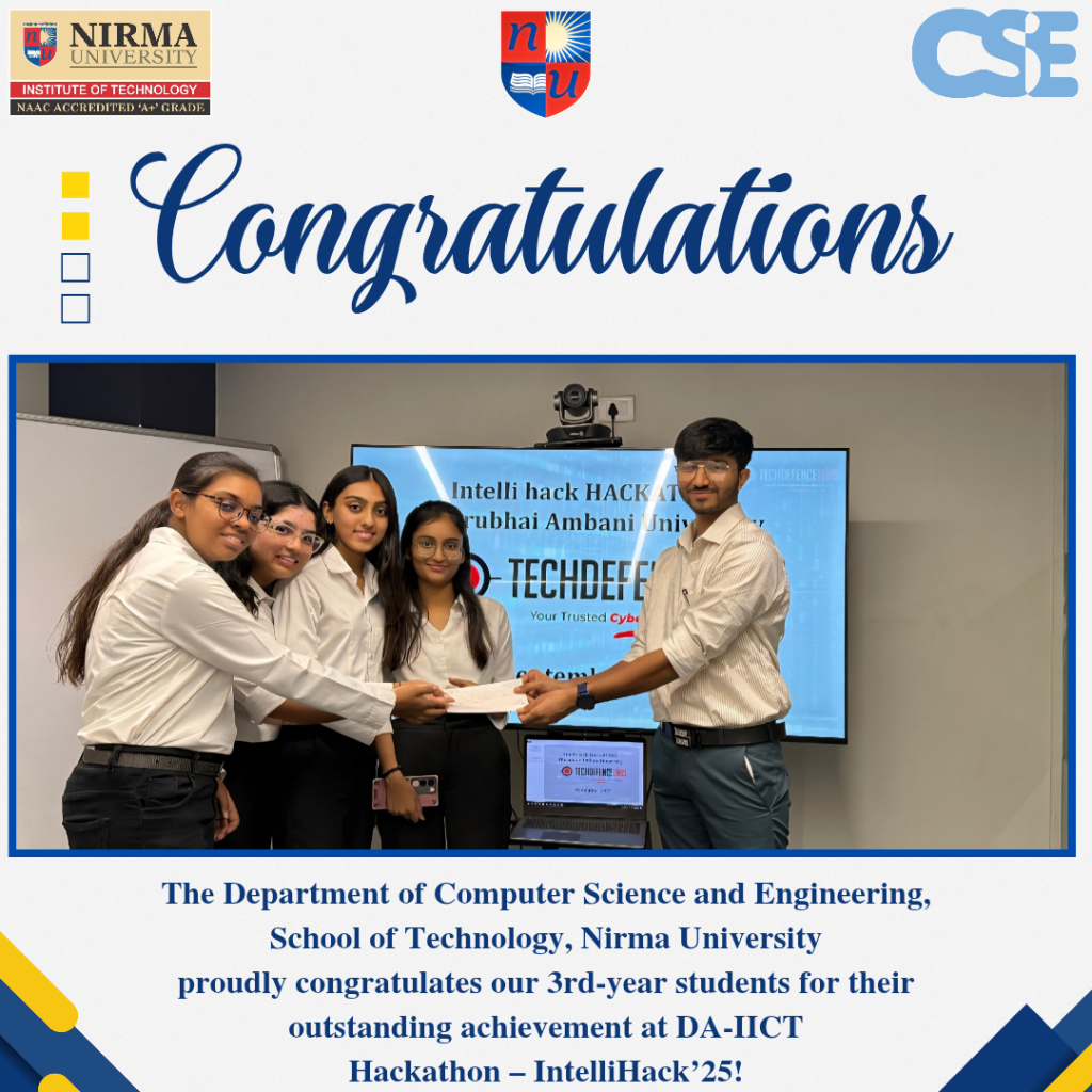 The Department of Computer Science and Engineering, School of Technology, Nirma University, proudly congratulates our 3rd-year students for their outstanding achievement at DA-IICT Hackathon – IntelliHack’25!