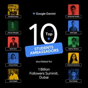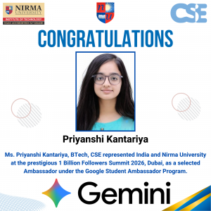 The Computer Science and Engineering Department, School of Technology, Nirma University has announced with pride that Ms. Priyanshi Kantariya (BTech, Computer Science and Engineering) represented India and Nirma University at the prestigious 1 Billion Followers Summit 2026, held in Dubai. She participated as a selected Ambassador under the Google Student Ambassador Program.